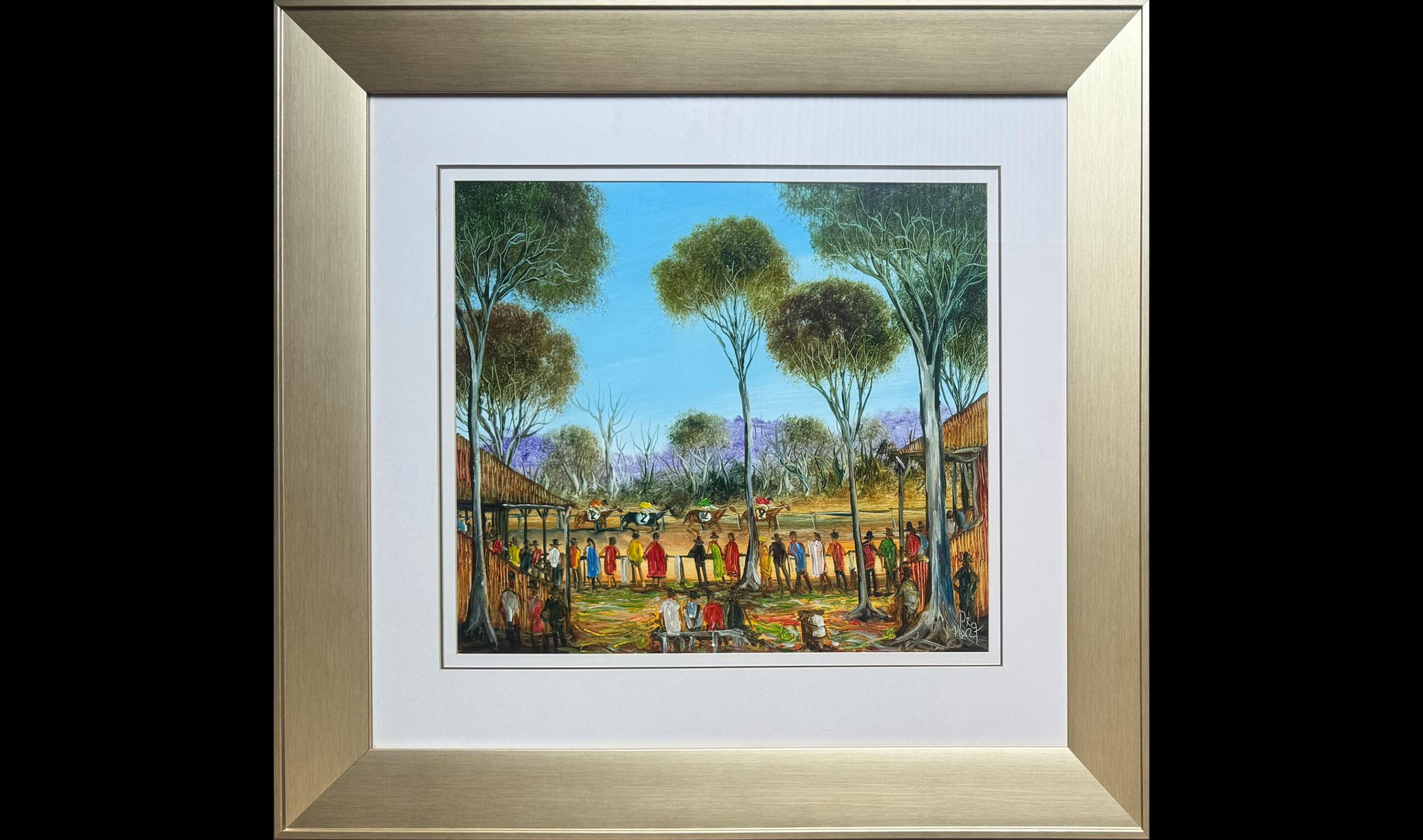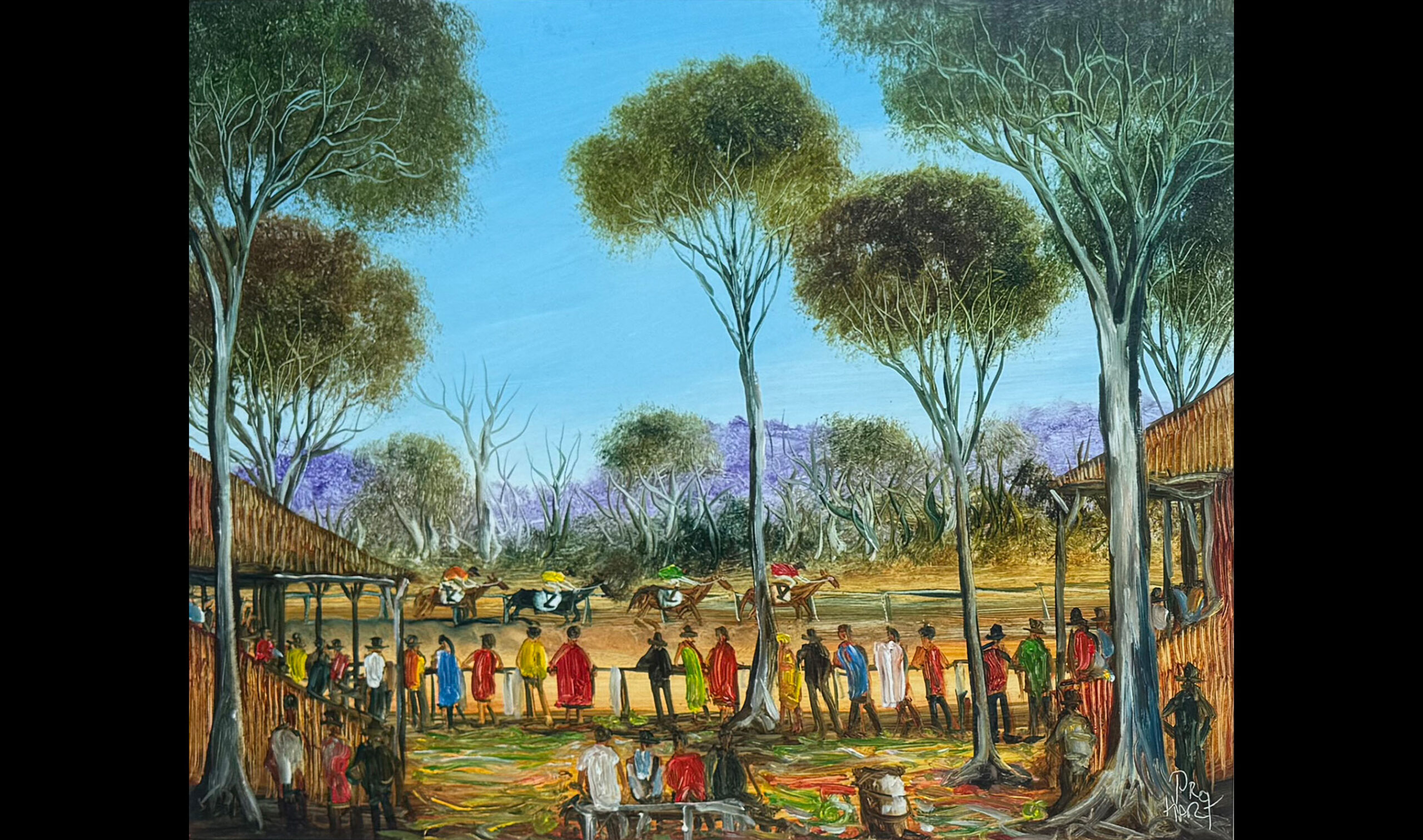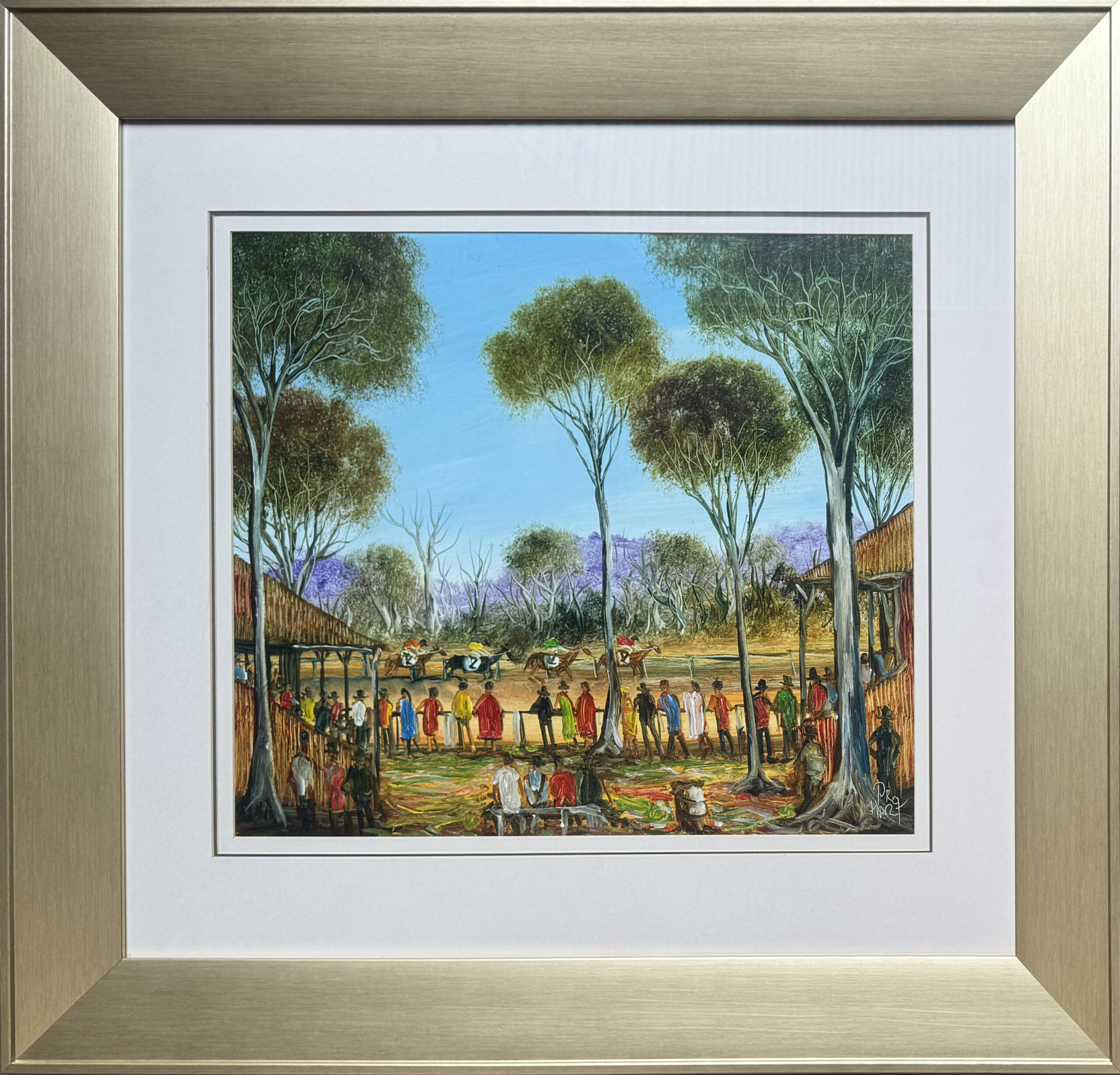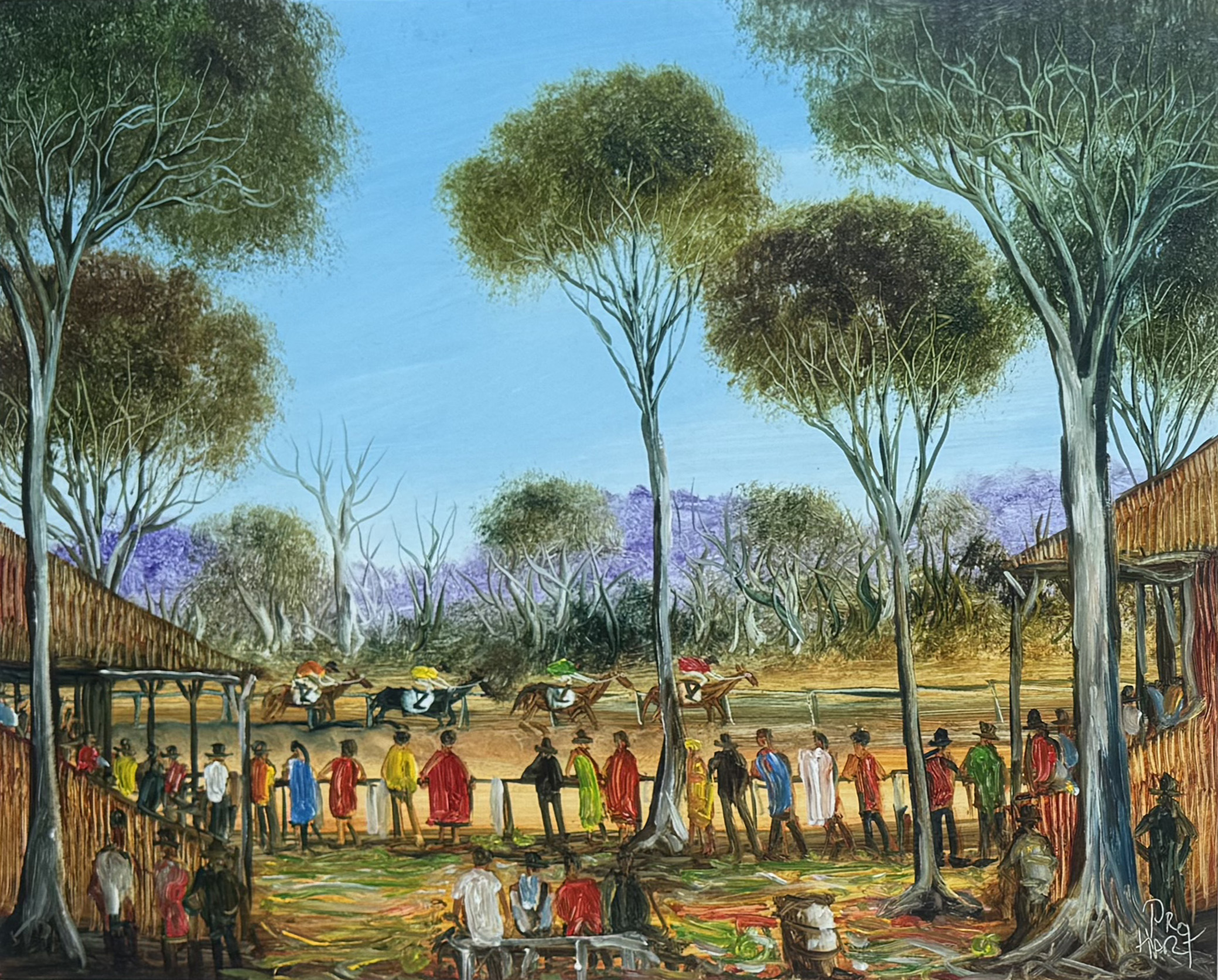 A Day at the Races is a warm and cheerful depiction of a common scene that can be found in the Broken Hill area. Pro became famous for his humorous and striking scenes of Broken Hill, showing people around the globe the realities of living in a small outback town.
