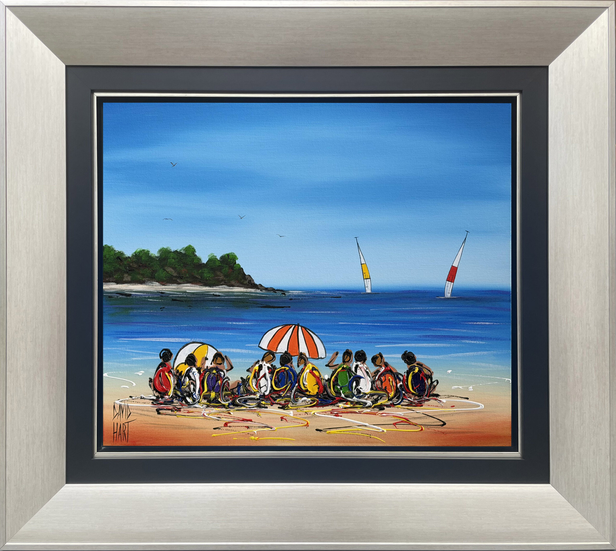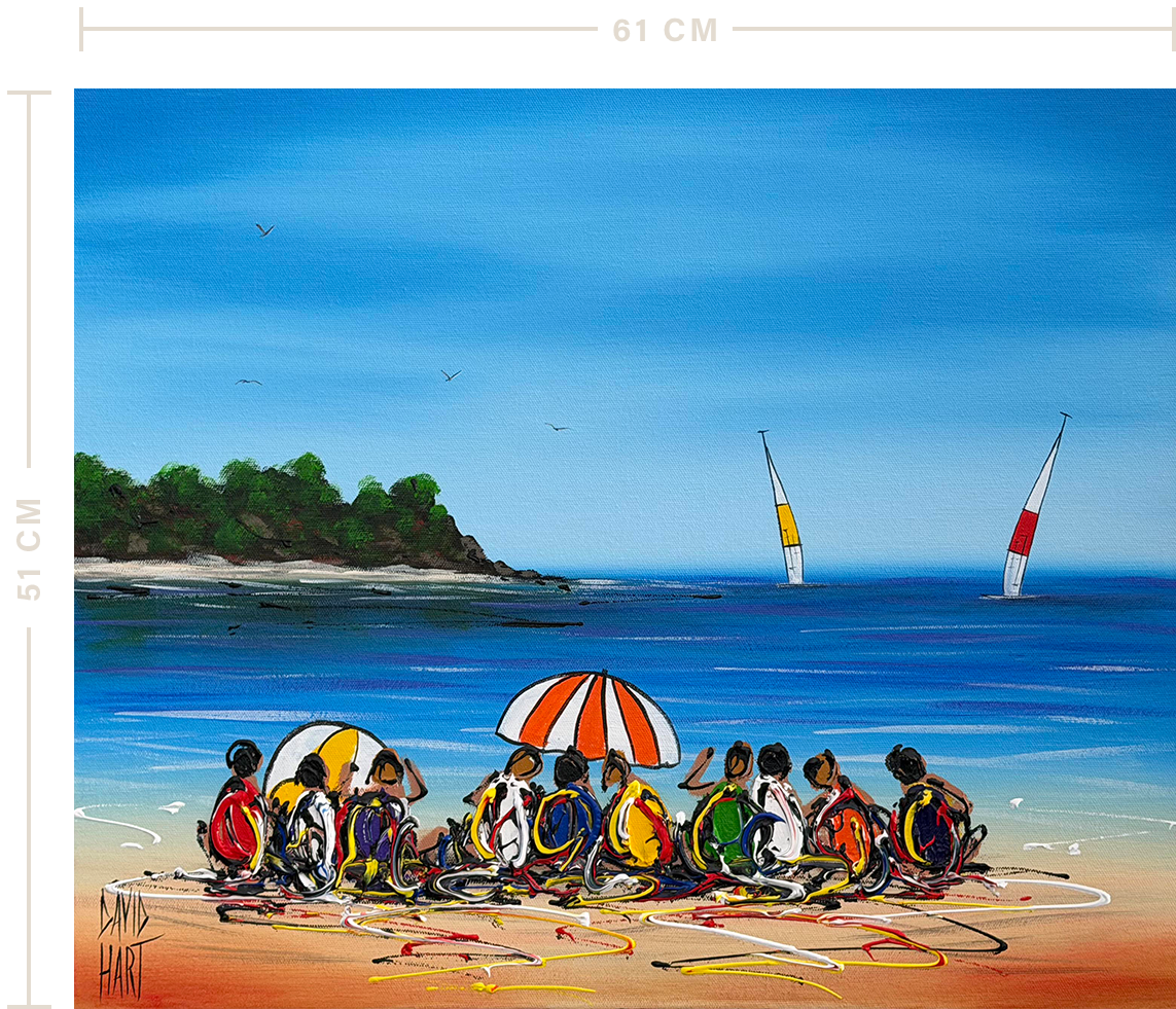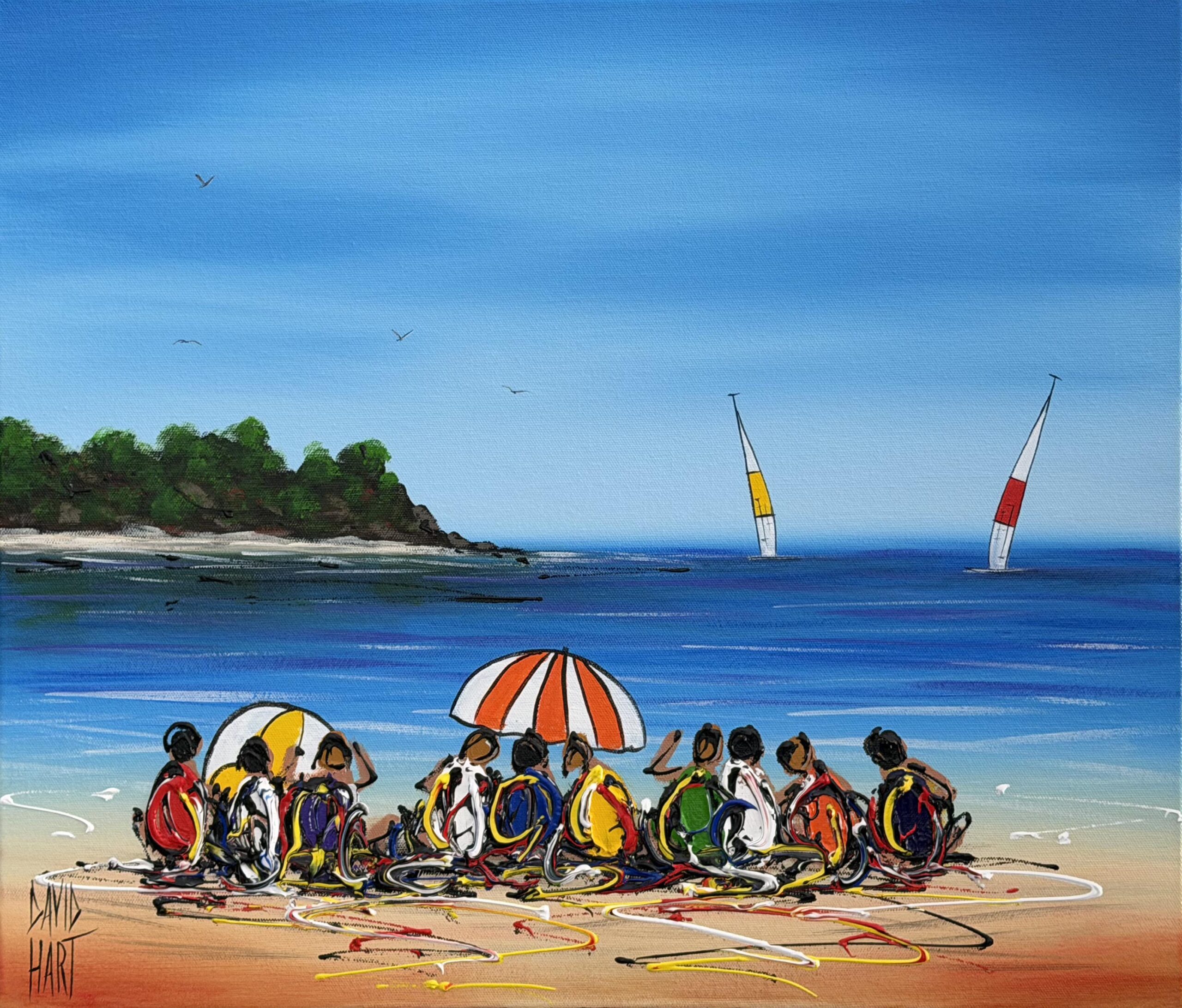 David’s busy beachscapes begin with a simple hand sketch onto canvas. After laying down his initial colour composition with brush and paint, he sets the work aside to dry for a day or two before overlaying the image with oils applied with a pallet knife.
