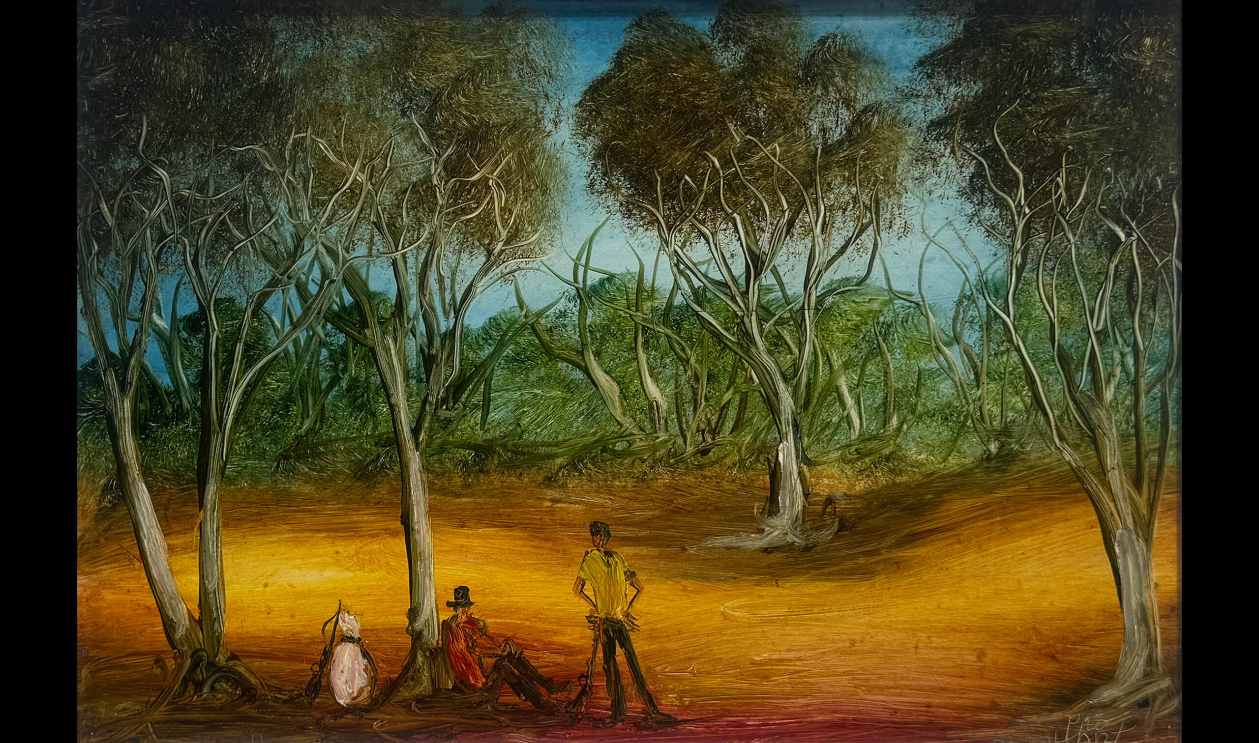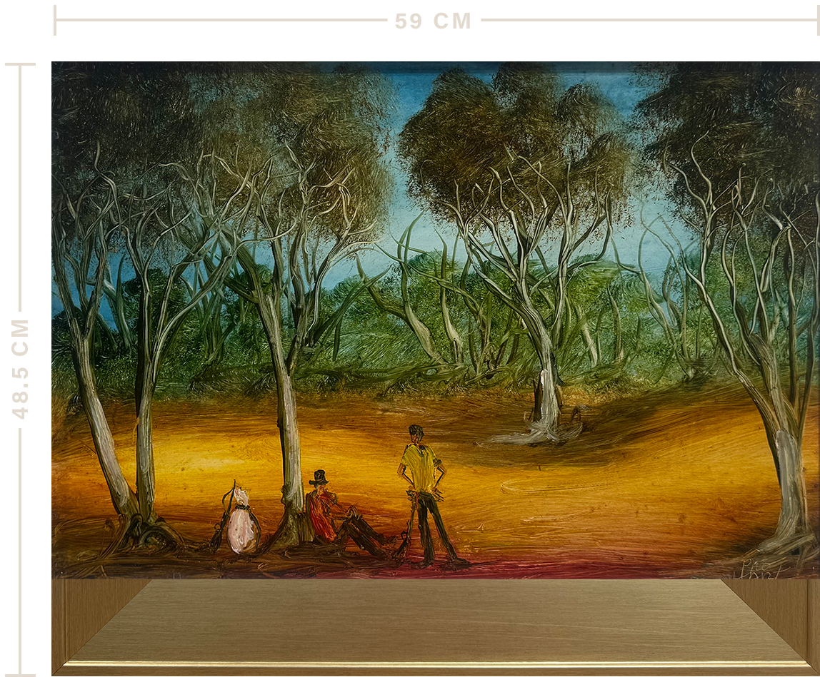 The Bushmen Resting is a warm and cheerful depiction of a common scene that can be found in the Broken Hill area. Pro became famous for his humorous and striking scenes of Broken Hill, showing people around the globe the realities of living in a small outback town.