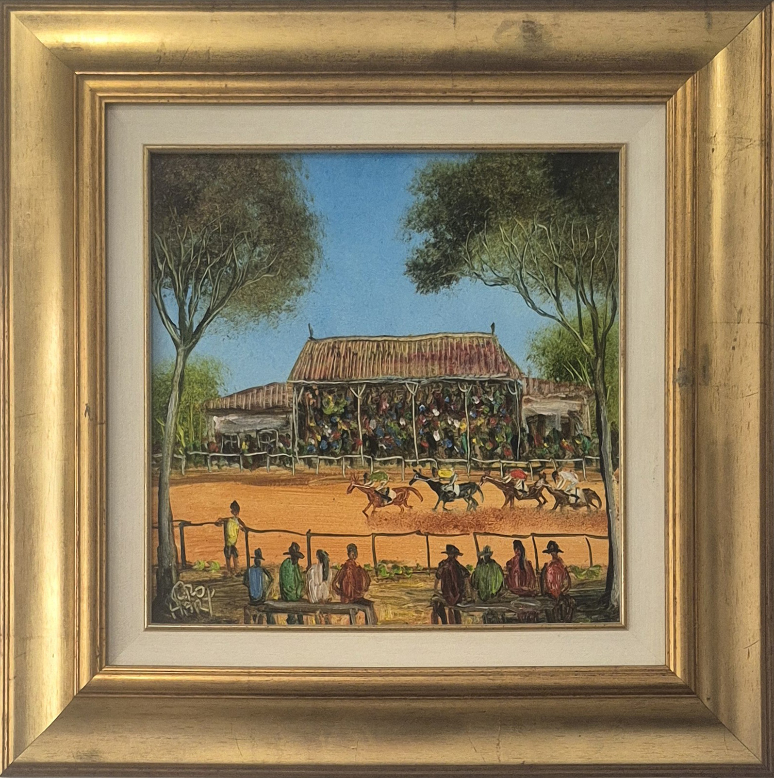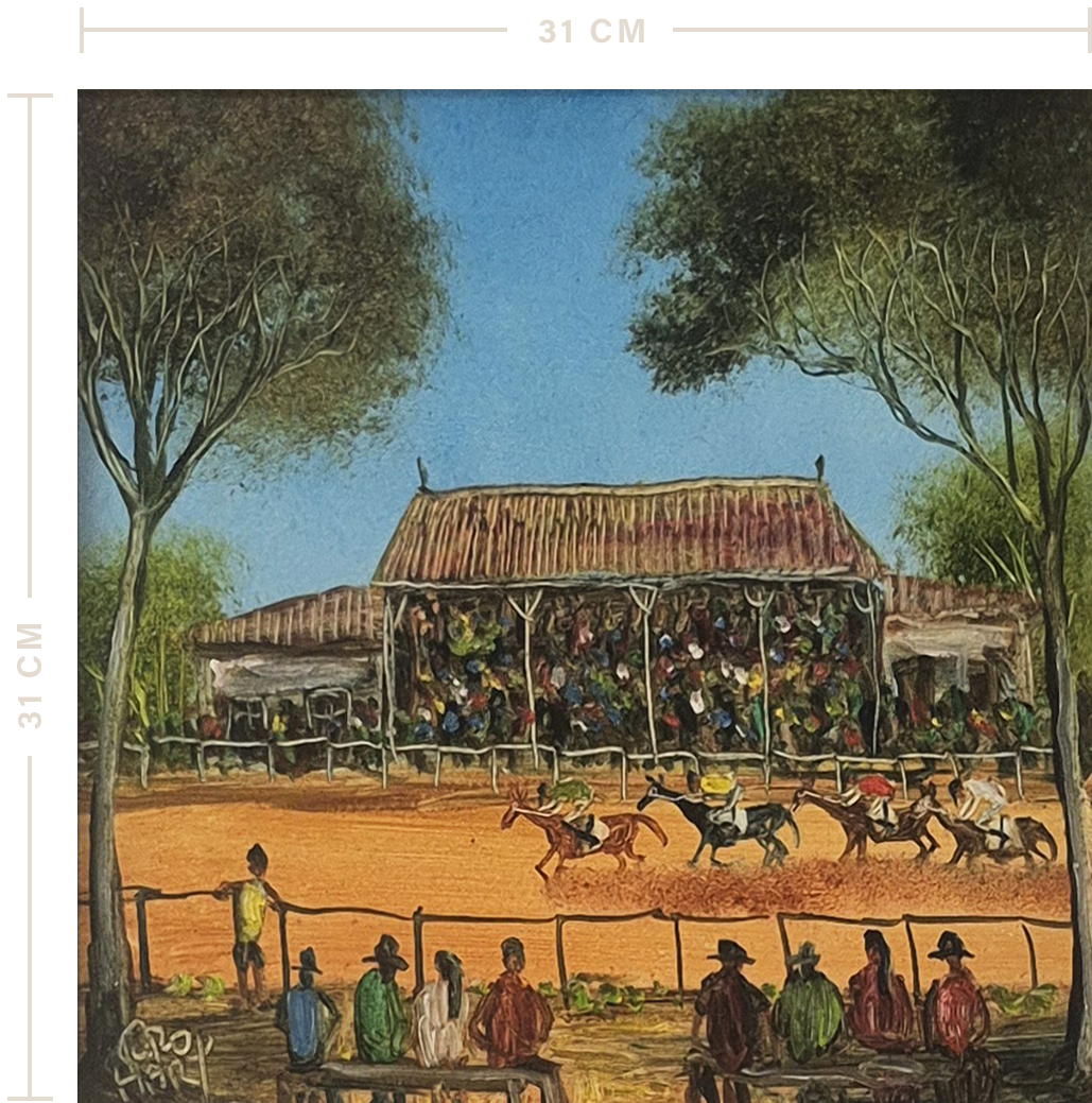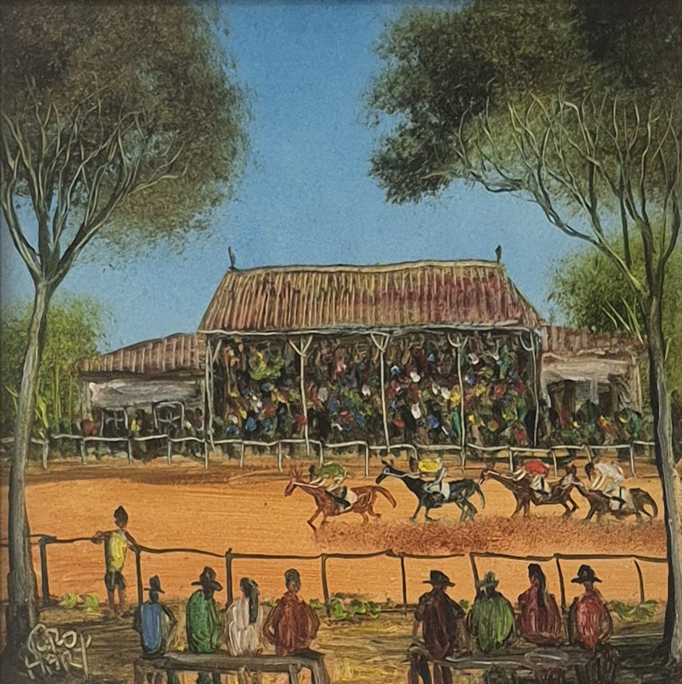 Country Races is a colourful depiction of a common scene that can be found in the Broken Hill area. Pro became famous for his humorous and striking scenes of Broken Hill, showing people around the globe the realities of living in a small outback mining town.