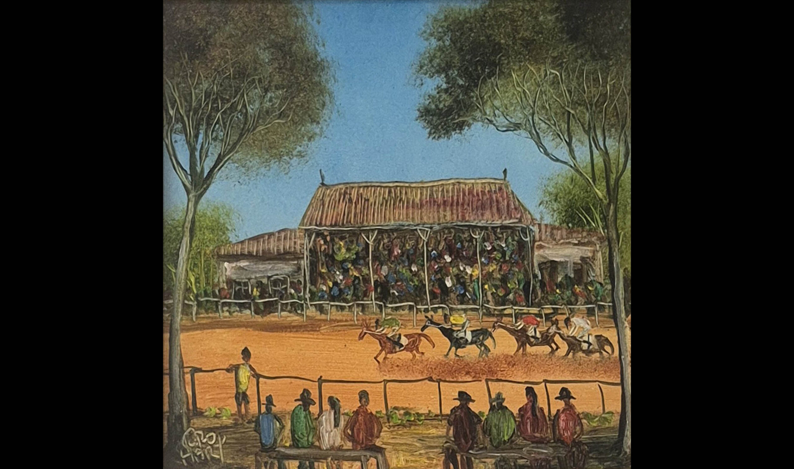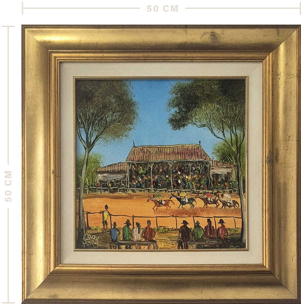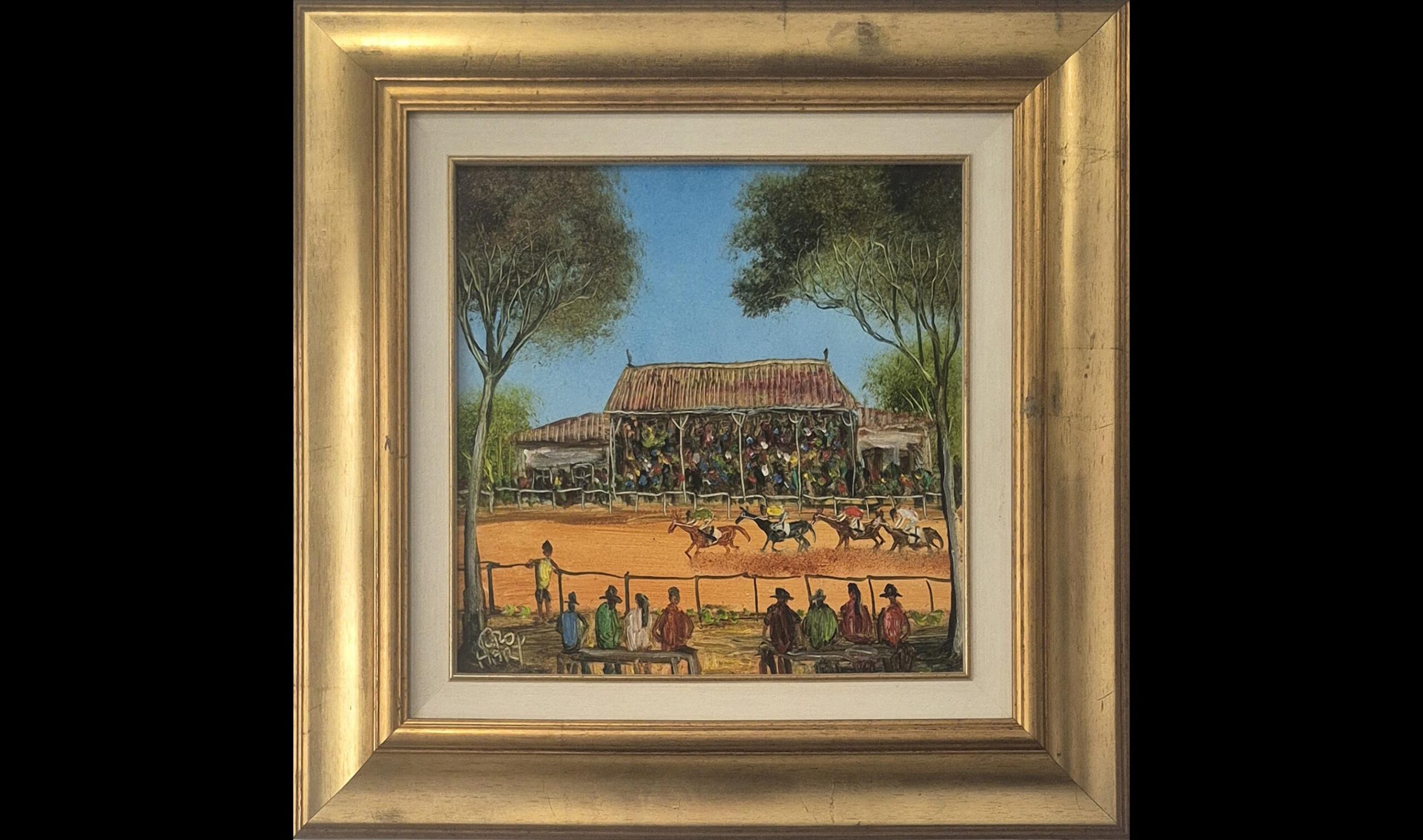 Country Races is a colourful depiction of a common scene that can be found in the Broken Hill area. Pro became famous for his humorous and striking scenes of Broken Hill, showing people around the globe the realities of living in a small outback mining town.