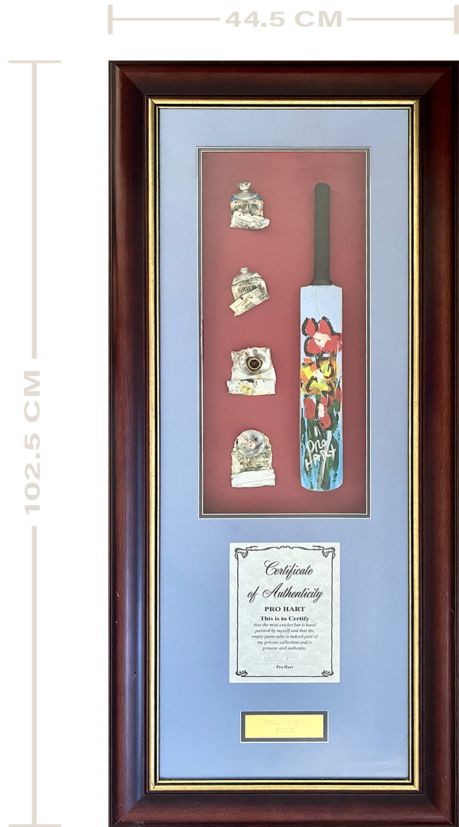 The Cricket Bat & Paint Tubes is a warm, light-hearted work that captures the unmistakable character of Broken Hill life. Using everyday objects drawn from both sport and studio, Pro Hart transforms the familiar into something playful and deeply personal. The cricket bat, an icon of Australian culture, paired with well-used paint tubes, reflects Pro’s own world, where art and outback living are inseparable.