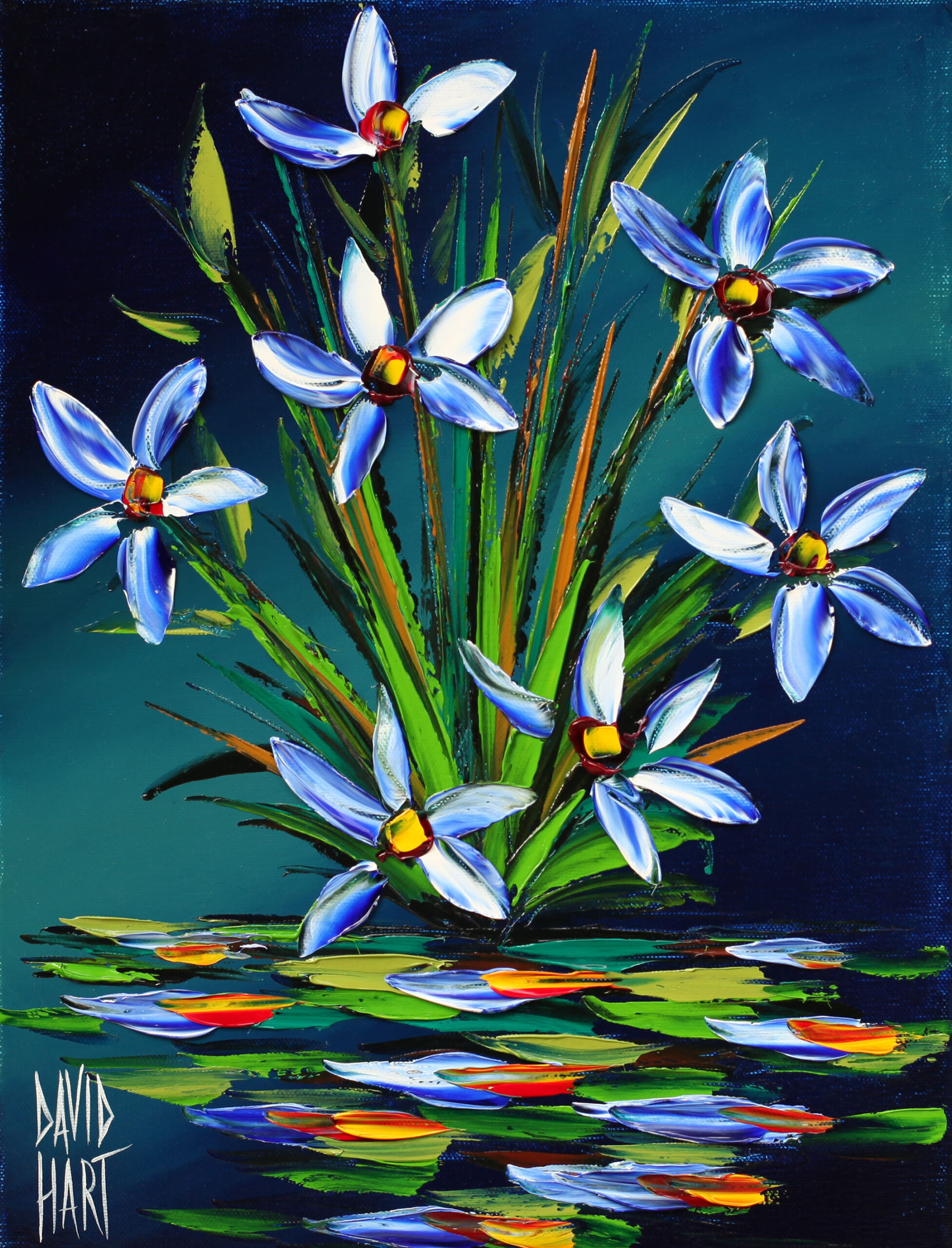 As he freely experiments with colour, and new methods of application, David’s flower images have taken on ever-evolving textures and energy over the years. Using a wide variety of mediums and painting implements, such as broad paint brushes and pallet knives, the flower series continues to mesmerise viewers with thick textures, movement, and colour.