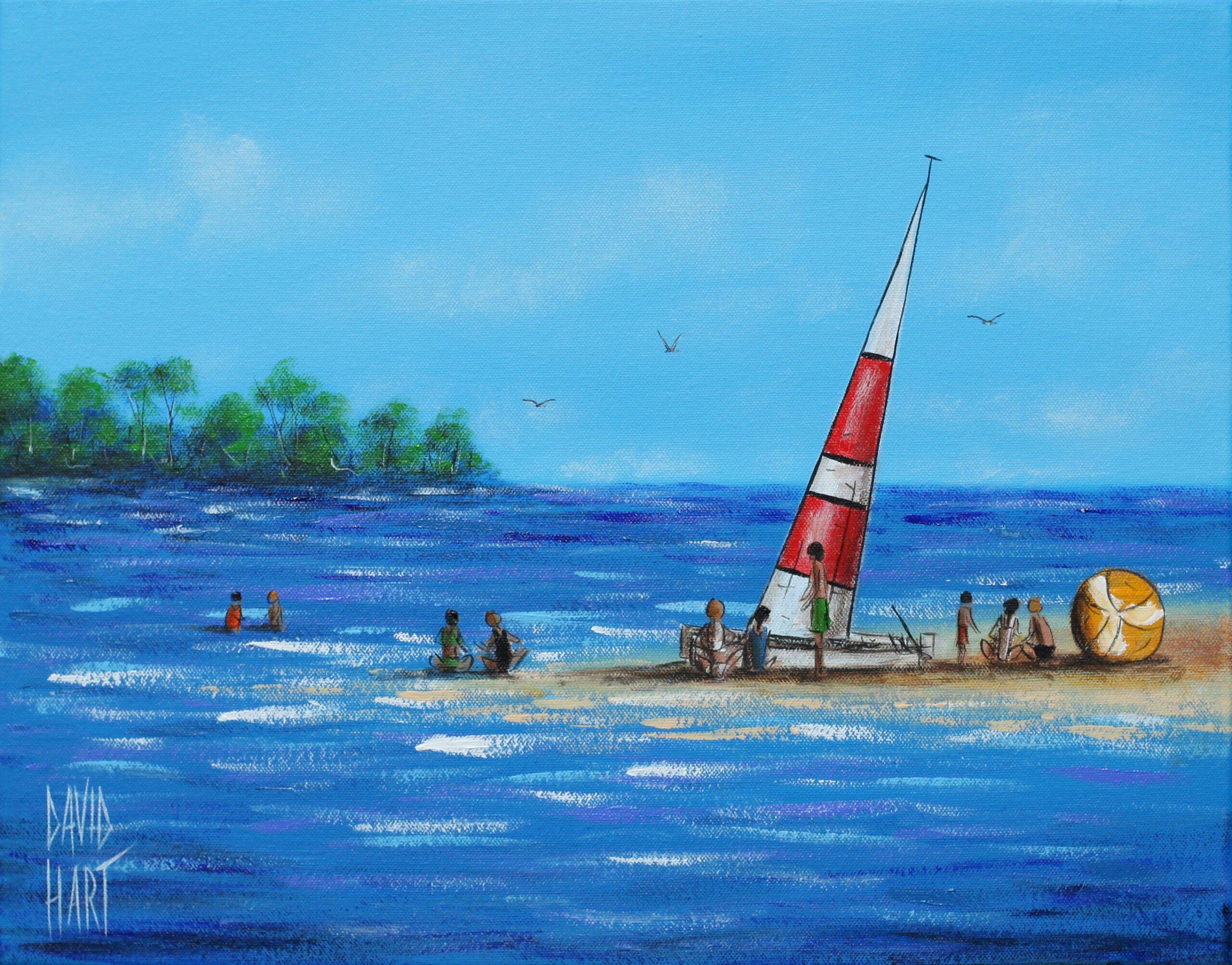 David’s busy beachscapes begin with a simple hand sketch onto canvas. After laying down his initial colour composition with brush and paint, he sets the work aside to dry for a day or two before overlaying the image with oils applied with a pallet knife.