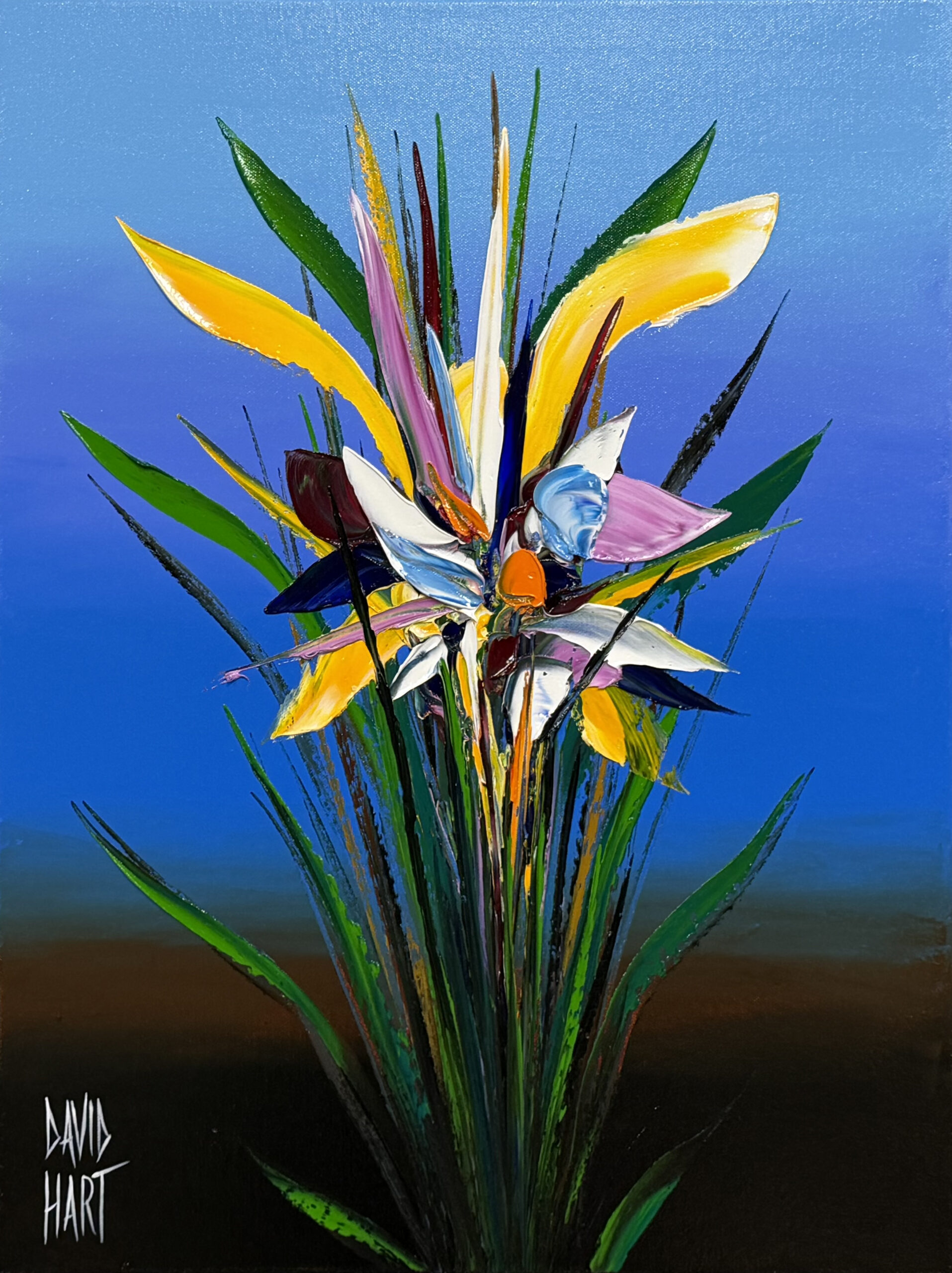As he freely experiments with colour, and new methods of application, David’s flower images have taken on ever-evolving textures and energy over the years. Using a wide variety of mediums and painting implements, such as broad paint brushes and pallet knives, the flower series continues to mesmerise viewers with thick textures, movement, and colour.
