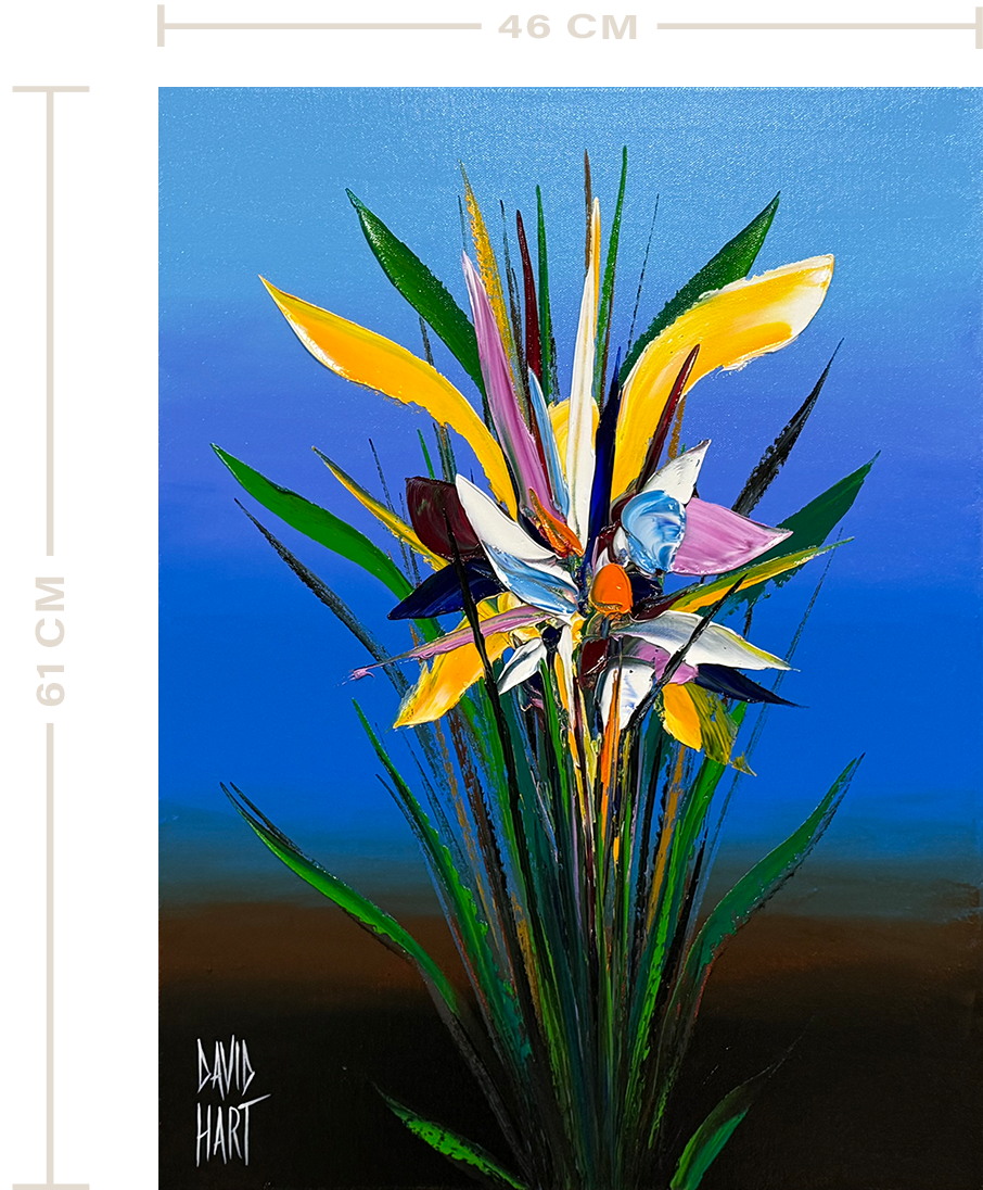 Without doubt one of David’s most popular subjects, this flower painting will transform any environment with a statement of style, vibrancy, and energy.