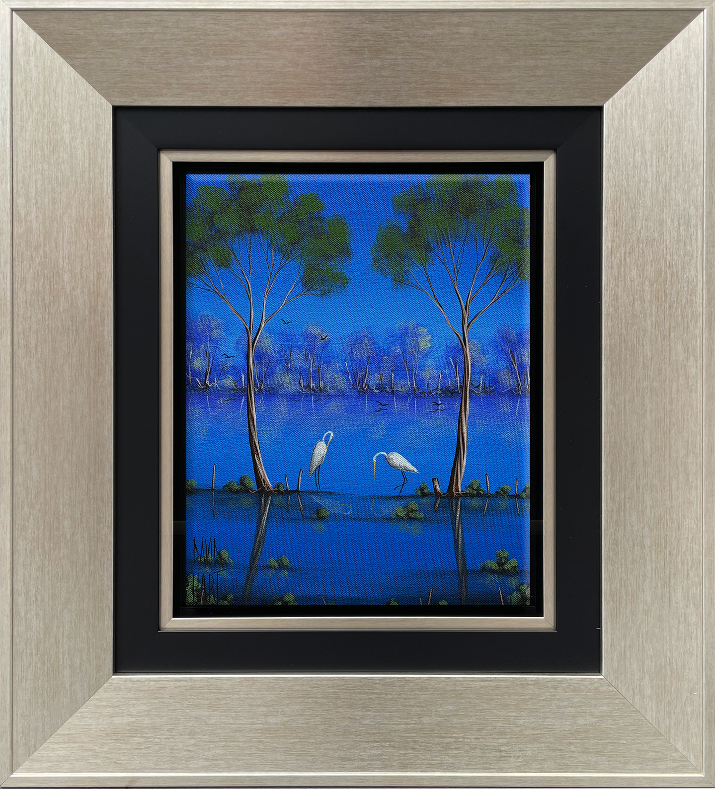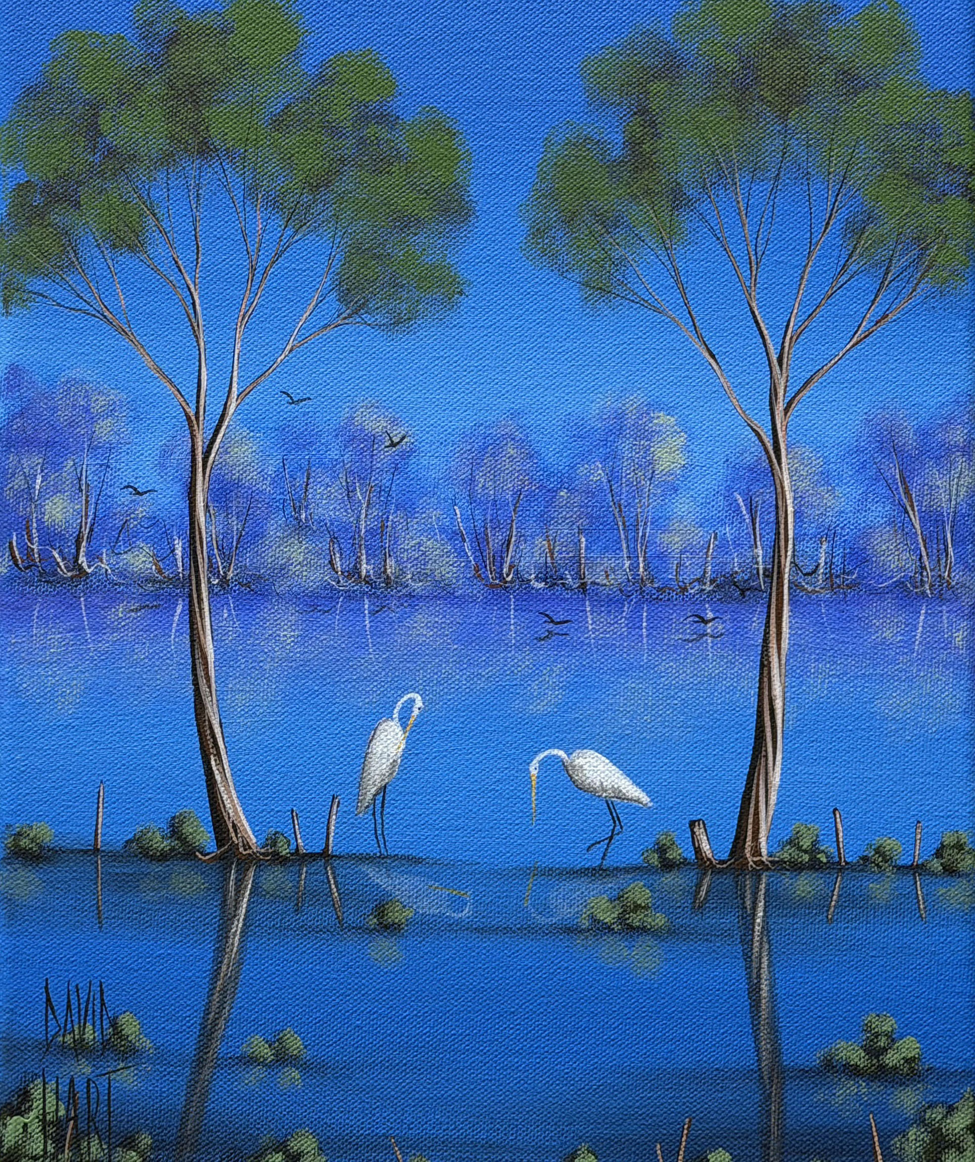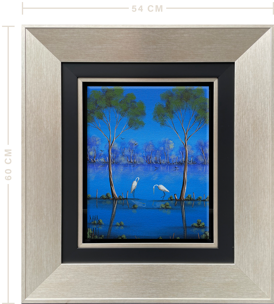 The serene and tranquil water scenes within this style are almost a complete flipside to David’s dusty landscapes, however these two styles  are very much connected to David’s heritage, and his life growing up in the outback.