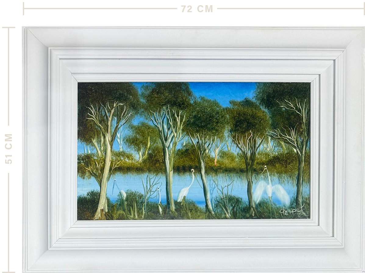 The paintings in Pro’s waterbirds series are reminiscent of his time growing up and exploring the Darling River while on family trips. They capture the tranquility of the moment that exists despite the liveliness and movement within the piece. The contrast of the softness of the birds and water with the harshness of the bush landscape is truely breathtaking.