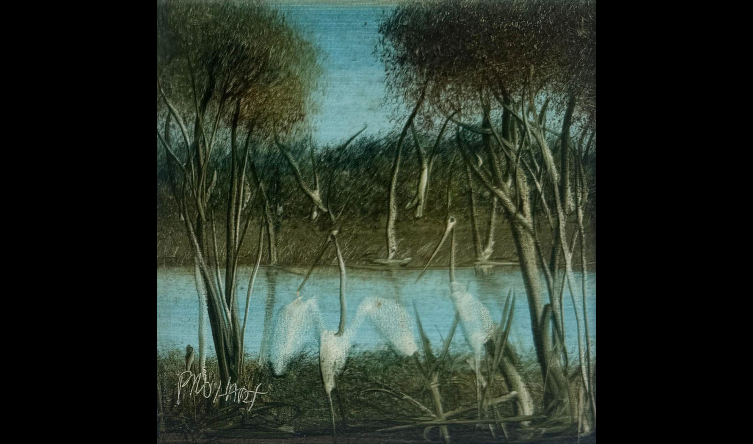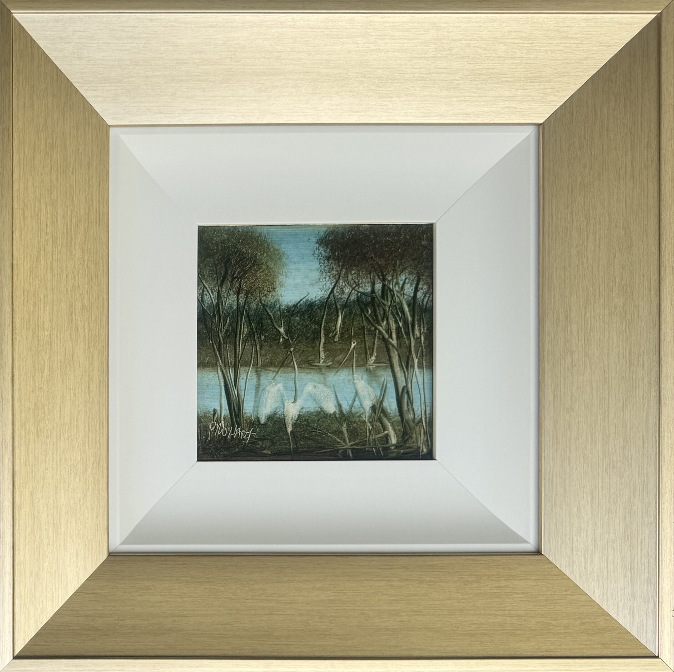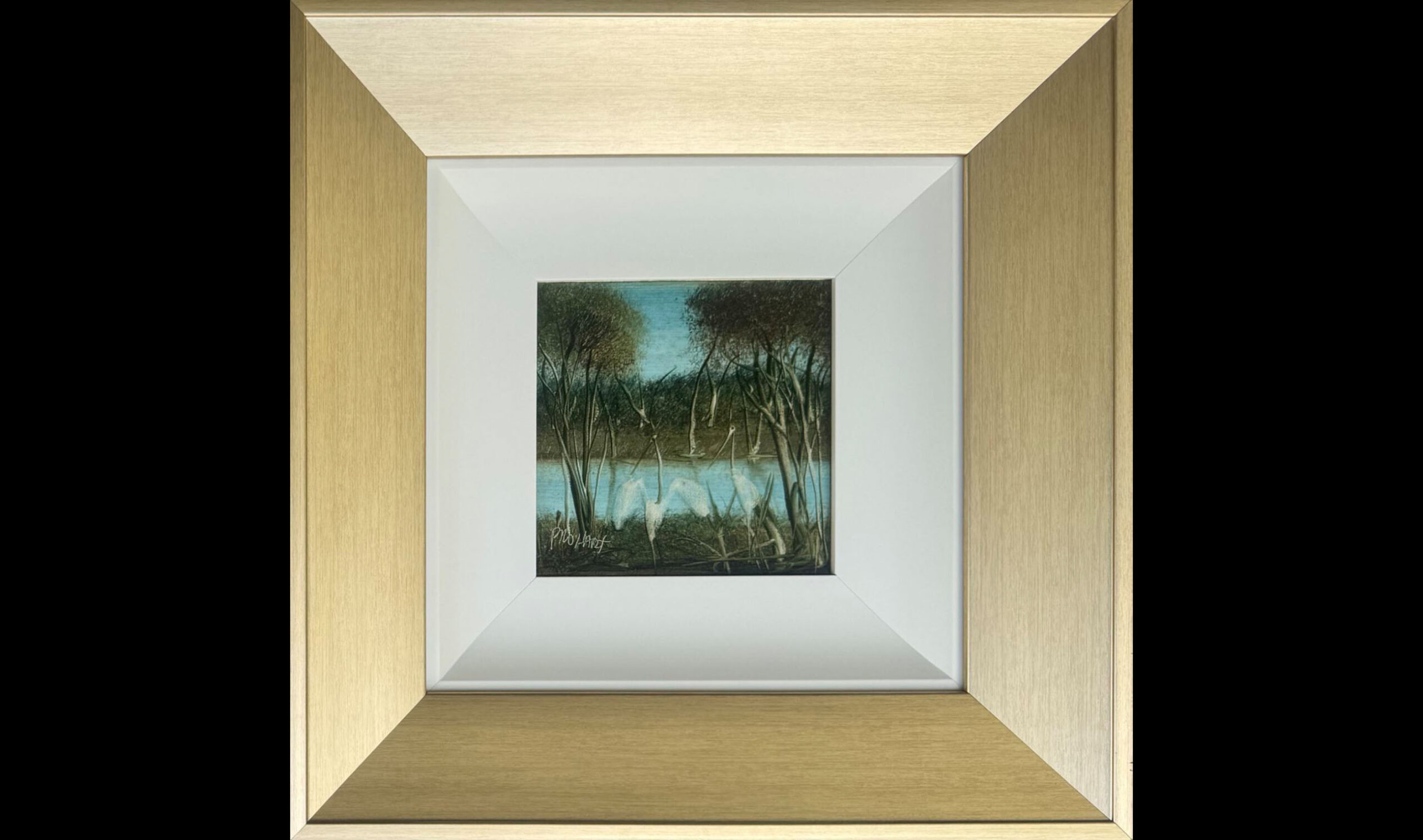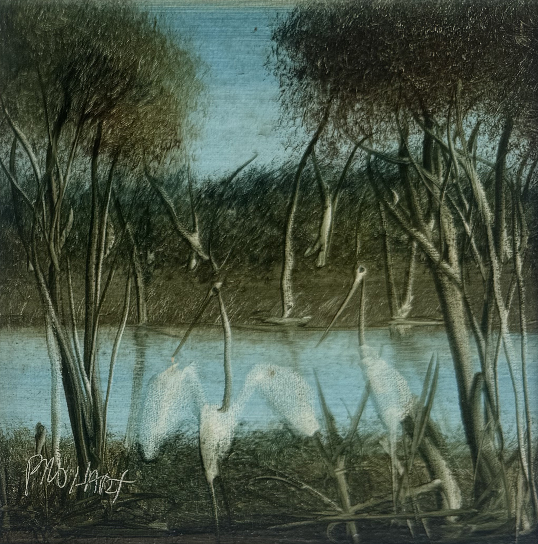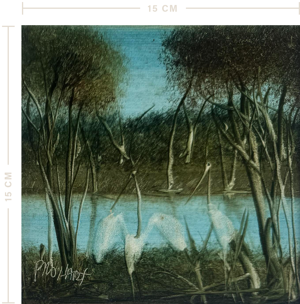The paintings in Pro’s waterbirds series are reminiscent of his time growing up and exploring the Darling River while on family trips. They capture the tranquility of the moment that exists despite the liveliness and movement within the piece. The contrast of the softness of the birds and water with the harshness of the bush landscape is truely breathtaking.
